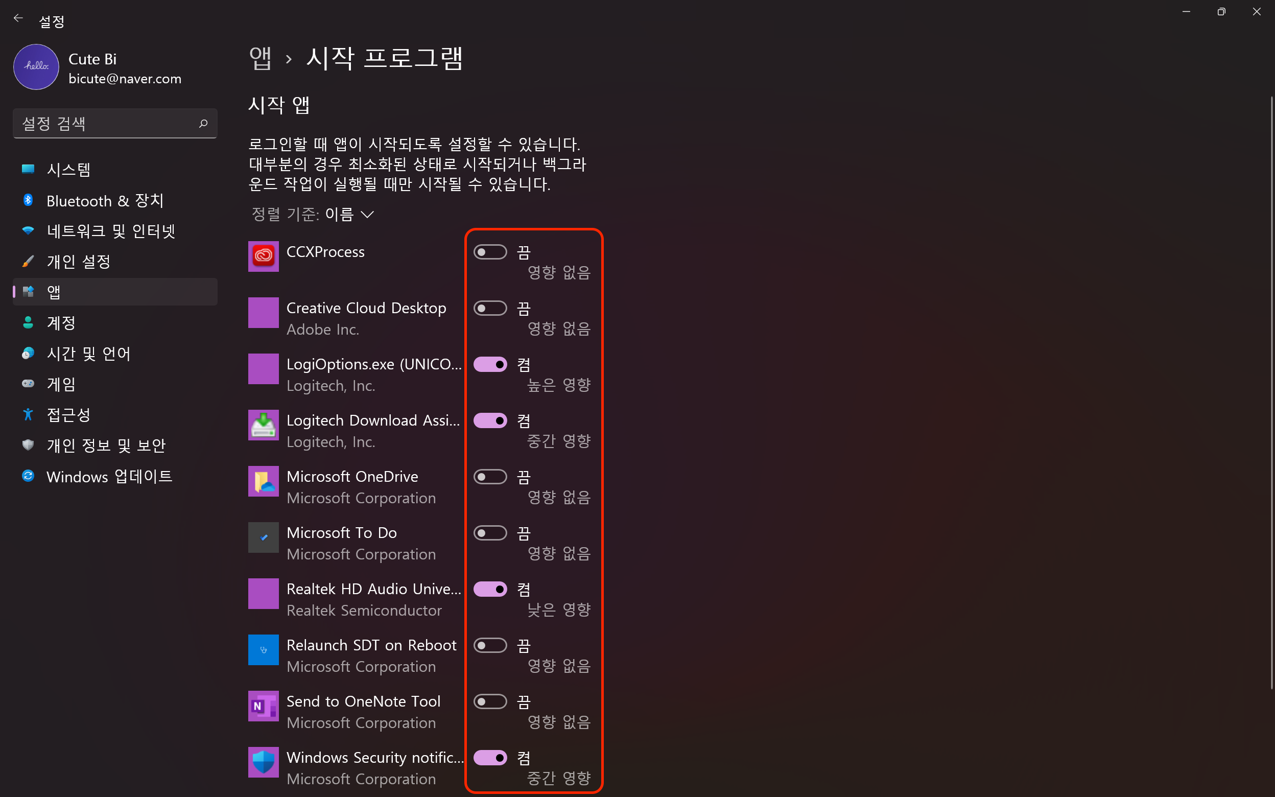 (3) 이곳에서 시작 프로그램을 확인하고 버튼을 눌러 ON/OFF로 설정해줄 수 있습니다.