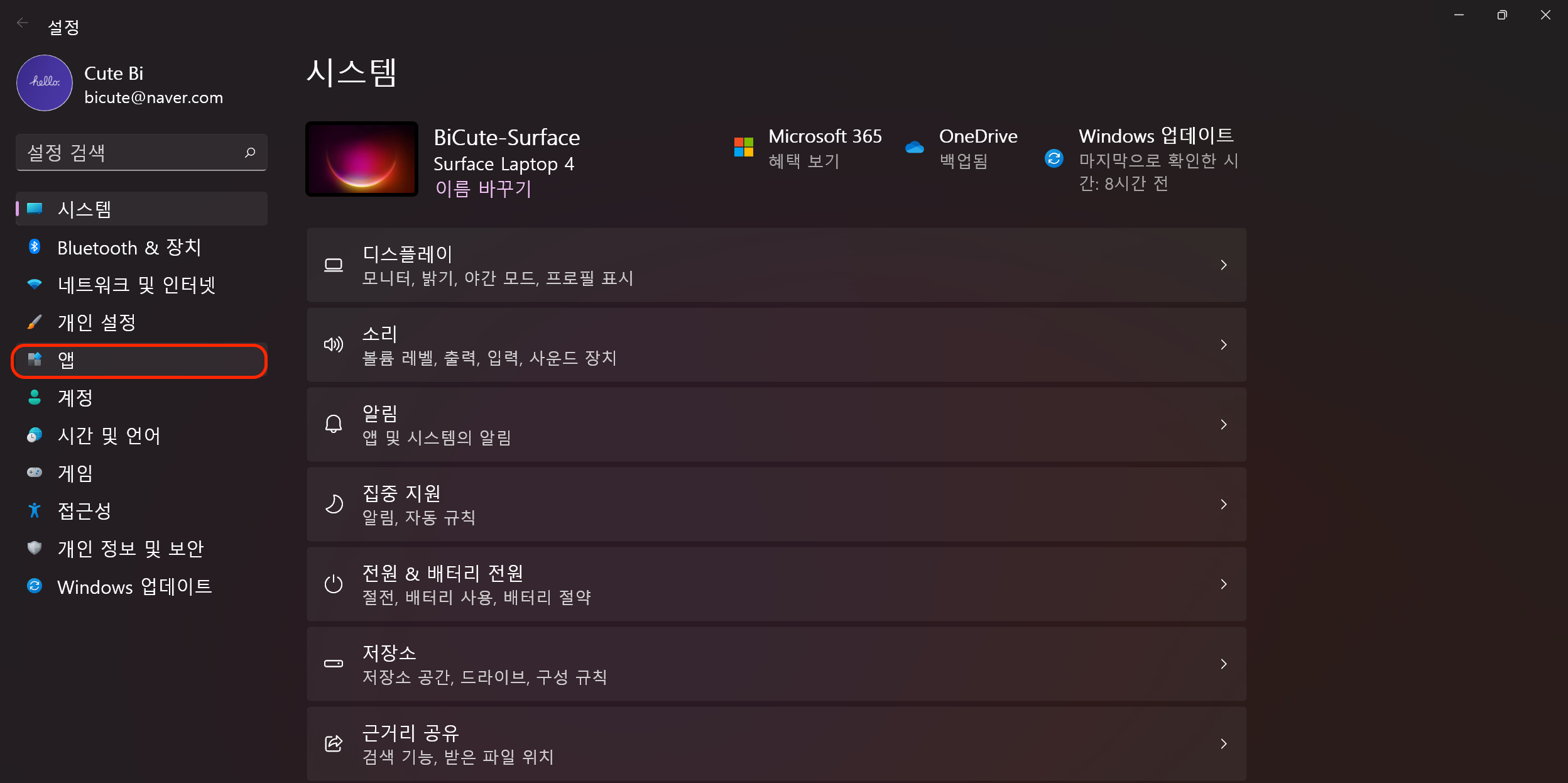 (1) "설정"으로 들어가서 사이드바에서 "앱"을 클릭합니다.