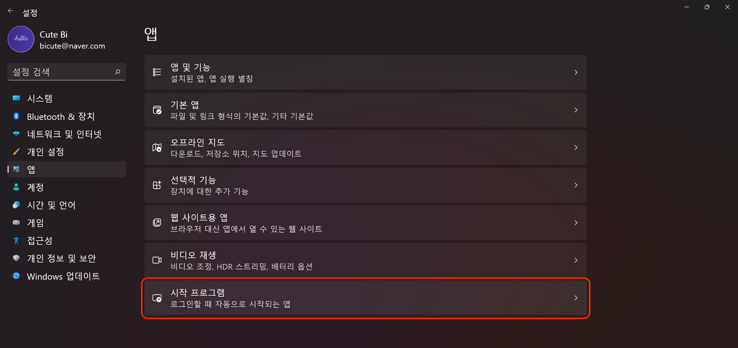 (2) "앱" 항목 중 "시작 프로그램"을 클릭합니다.
