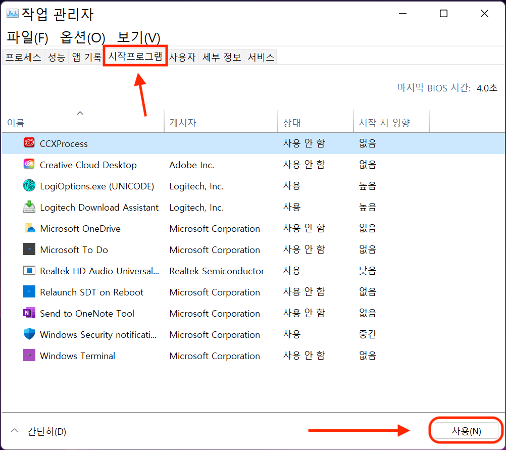 시작 프로그램 탭으로 이동하여 원하는 프로그램을 선택하면 오른쪽 아래에 사용할 것인지 안 할 것인지를 체크할 수 있습니다.