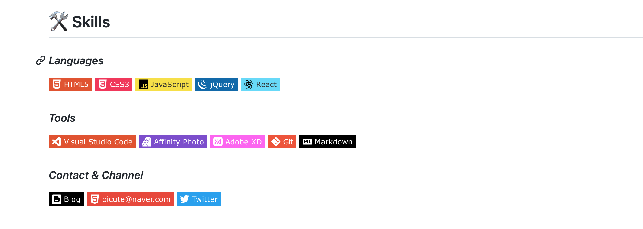 배지의 앞쪽에 아이콘은 https://simpleicons.org/ 이곳에서 확인할 수 있으며, 최종적으로 2가지를 합쳐서 적용하는 방법은 다음과 같습니다.