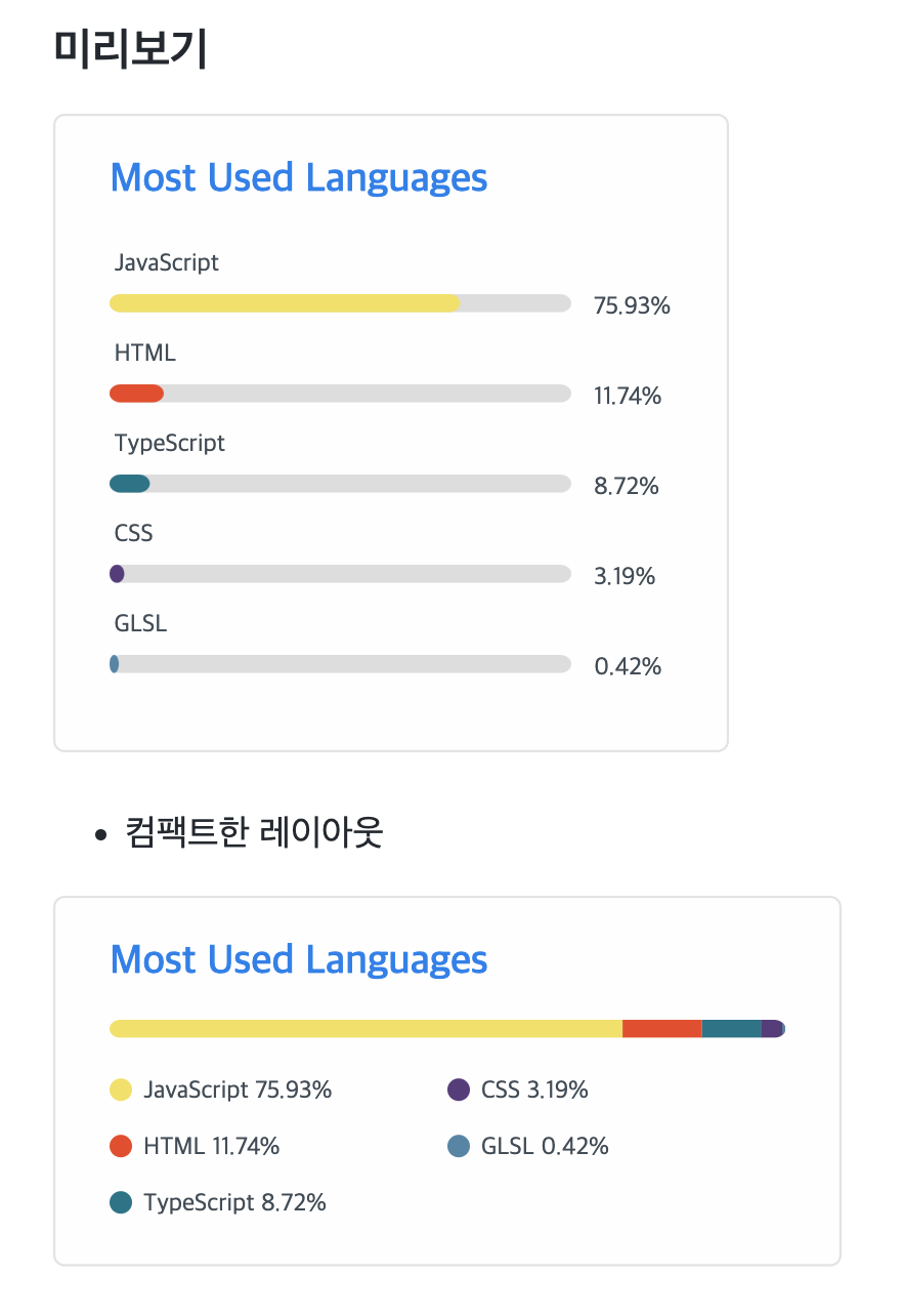 깃허브 통계 / 언어별 통계 등 다양한 테마도 지원하고 있습니다.