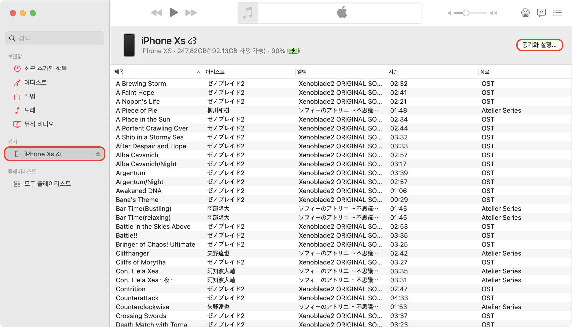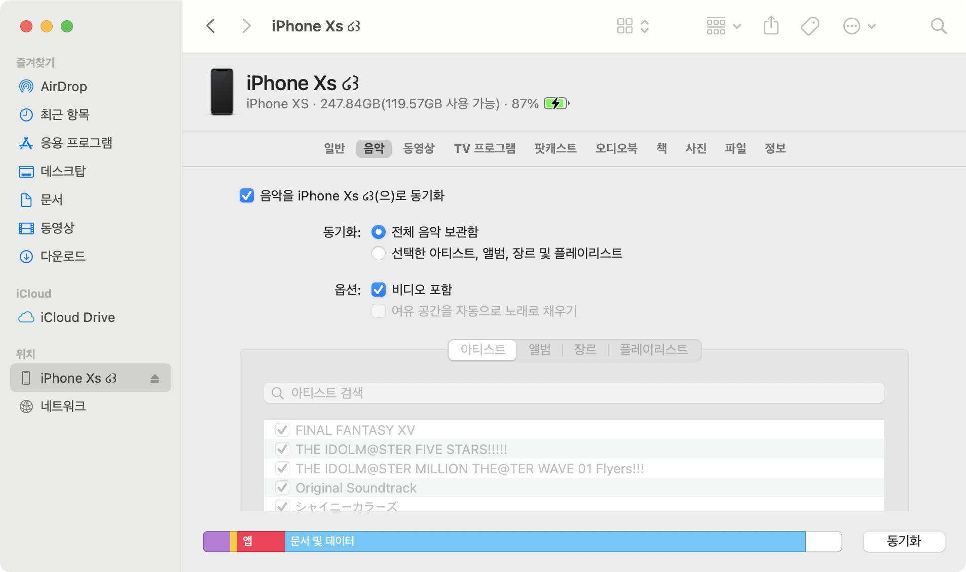 가장 위에 있는 '동기화'를 체크한 후 왼쪽 아래에 있는 동기화 버튼을 누르면 Mac의 음악 앱에 보이는 모든 음악이 그대로 iPhone으로 복사가 됩니다.
