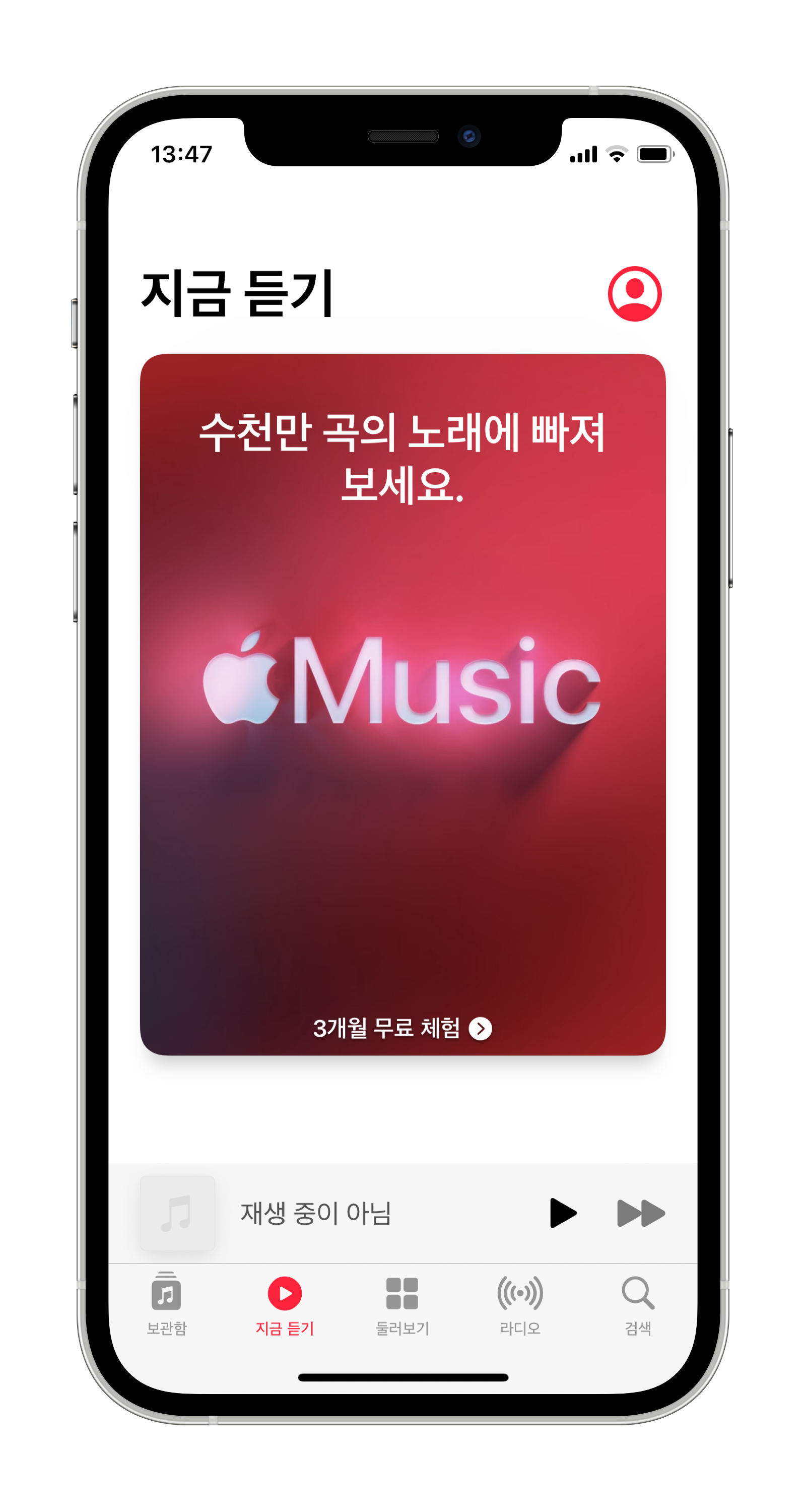 iPhone에서 음악 앱을 실행시켜보면 아래쪽에 탭이 5개가 있으며 계속해서 Apple Music에 가입하라는 권유창이 나타납니다.